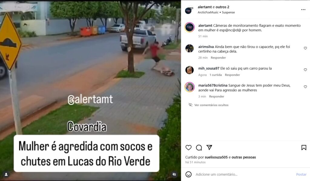 Na gravação é possível ver o momento em que o homem se aproxima de caminhonete da vítima que está numa motocicleta. Em seguida, ele desce do veículo, pega um objeto no chão e arremessa contra a mulher que tenta correr deixa a moto ao lado da calçada.