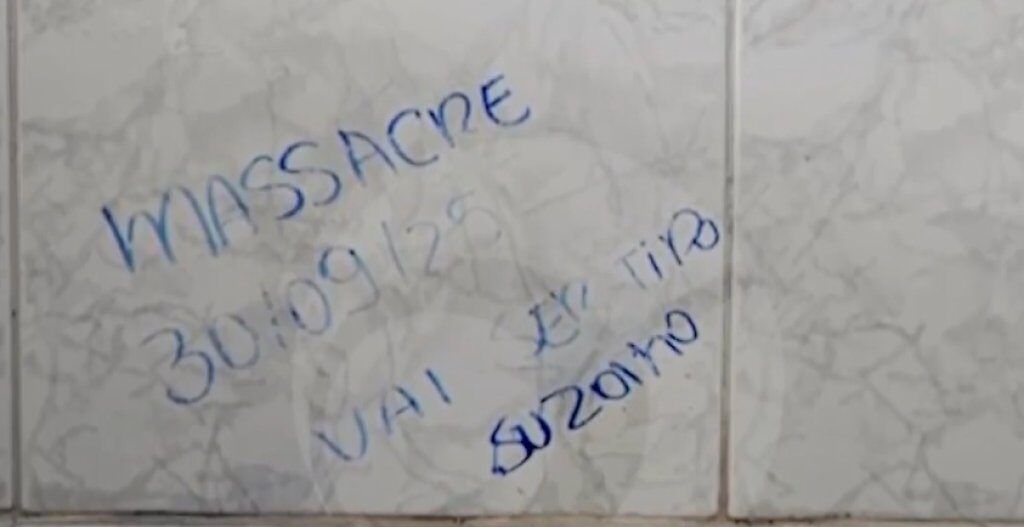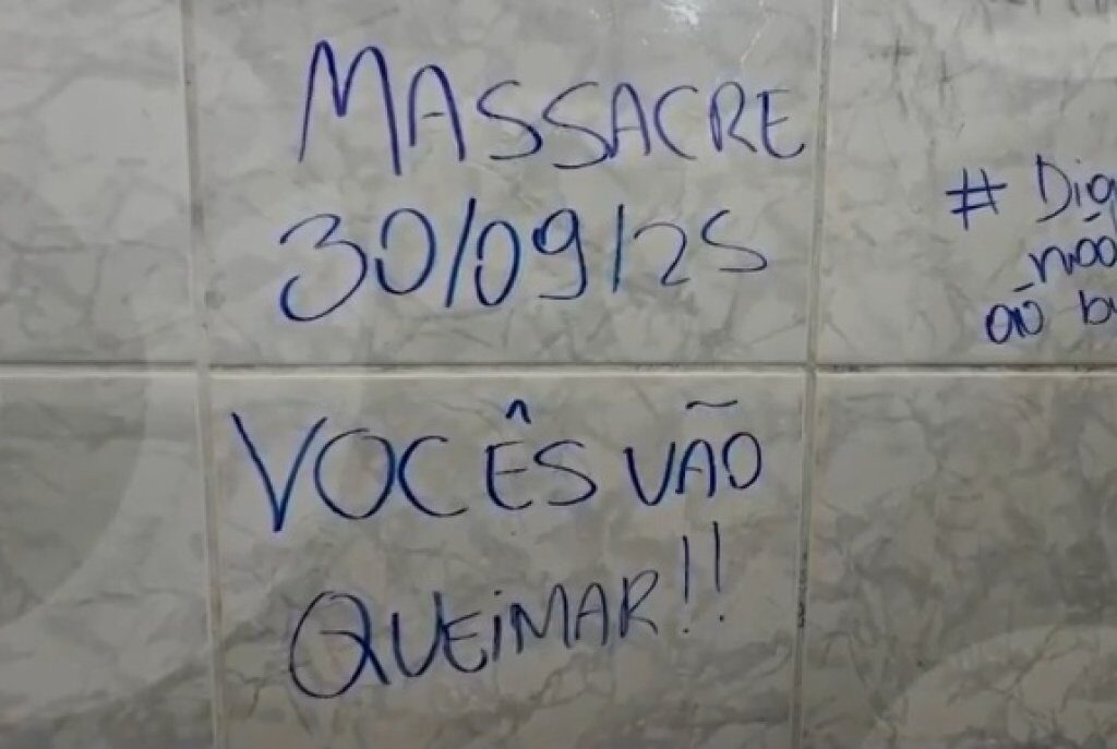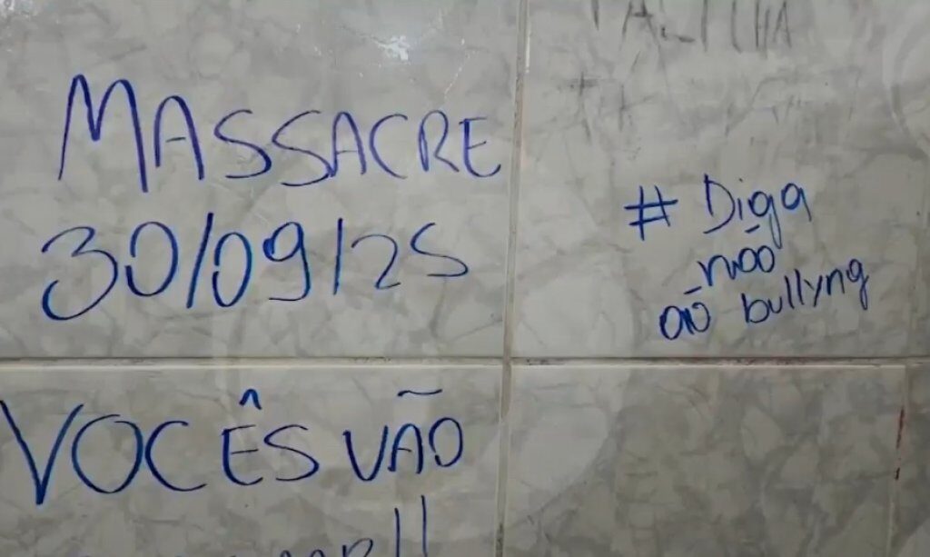 Segundo o boletim, funcionárias da limpeza localizaram pichações indicando a possibilidade de um massacre na unidade. Entre as frases escritas estavam “#DigaNãoAoBullying”, “30/09/2025 vocês vão queimar”, além de “Massacre 30/09”, vai ser igual Suzano, em referência ao massacre escolar ocorrido em 13 de março de 2019, na Escola Estadual Professor Raul Brasil no município de Suzano, no estado de São Paulo.