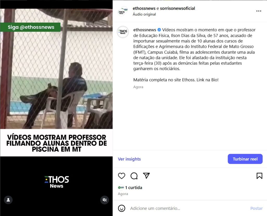 Vídeos obtidos por FolhaMax mostram o momento em que o professor de Educação Física, Ilson Dias da Silva, de 57 anos, acusado de importunar sexualmente mais de 10 alunas dos cursos de Edificações e Agrimensura do Instituto Federal de Mato Grosso (IFMT), Campus Cuiabá, filma as adolescentes durante uma aula de natação da unidade. Ele foi afastado da instituição nesta terça-feira (30) após as denúncias feitas pelas estudantes ganharem os noticiários.