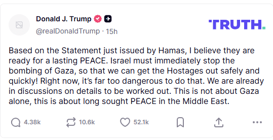 O Hamas, por meio de comunicado, manifestou acordo para libertar todos os reféns israelenses, vivos ou mortos, conforme o plano de paz proposto pelos Estados Unidos. O grupo também aceitou transferir a gestão de Gaza para uma entidade palestina independente, respaldada por consenso nacional e apoio árabe e islâmico.
