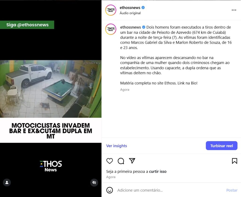 Dois homens foram executados a tiros dentro de um bar na cidade de Peixoto de Azevedo (674 km de Cuiabá) durante a noite de terça-feira (7). As vítimas foram identificadas como Marcos Gabriel da Silva e Marlon Roberto de Souza, de 16 e 23 anos.