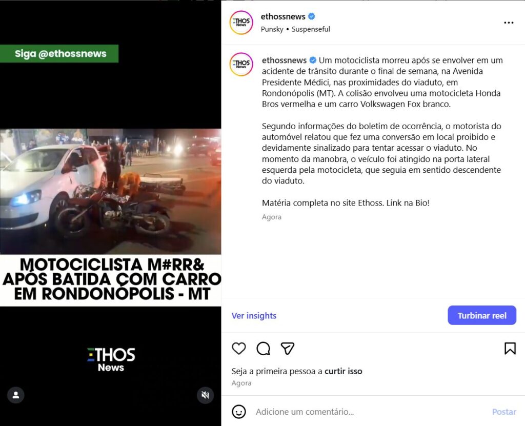 Um motociclista morreu após se envolver em um acidente de trânsito durante o final de semana, na Avenida Presidente Médici, nas proximidades do viaduto, em Rondonópolis (MT). A colisão envolveu uma motocicleta Honda Bros vermelha e um carro Volkswagen Fox branco.