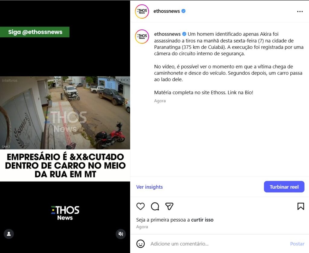 Um homem identificado apenas Akira foi assassinado a tiros na manhã desta sexta-feira (7) na cidade de Paranatinga (375 km de Cuiabá). A execução foi registrada por uma câmera do circuito interno de segurança.