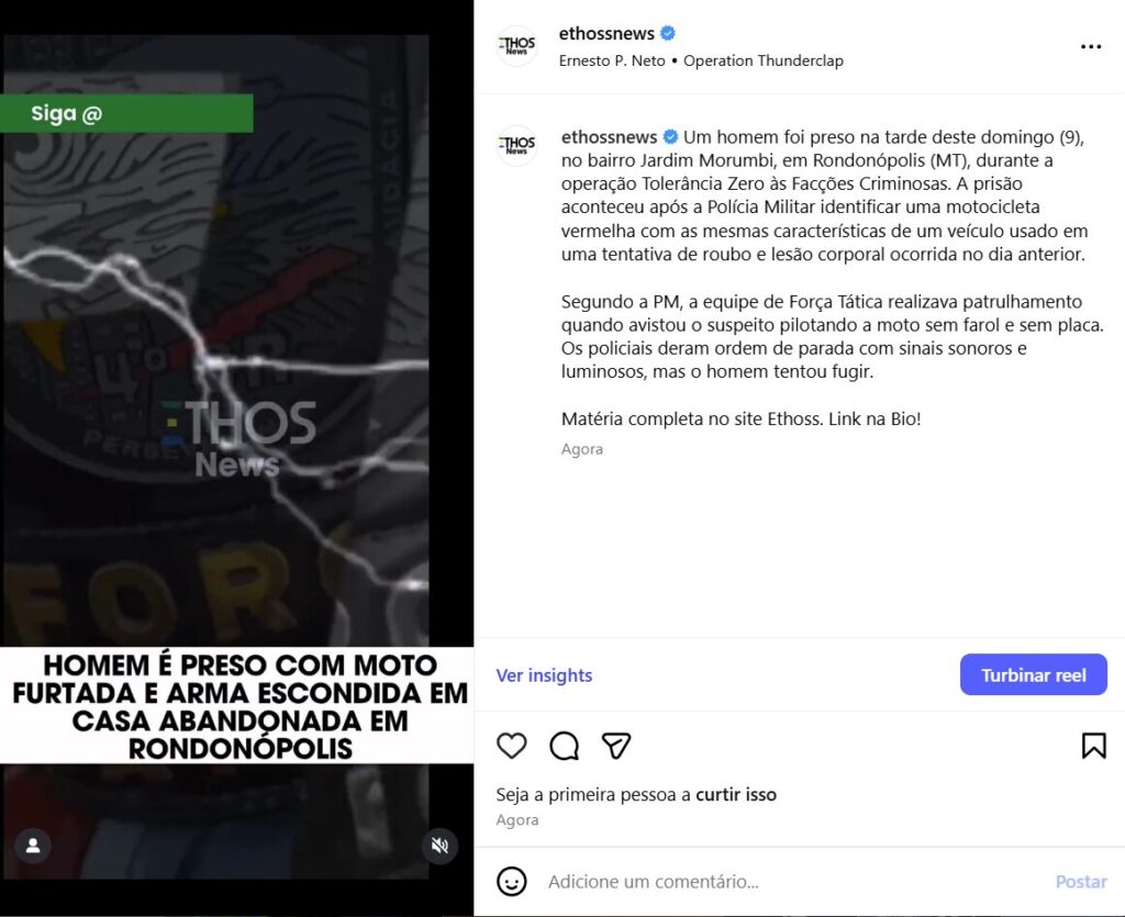 Um homem foi preso na tarde deste domingo (9), no bairro Jardim Morumbi, em Rondonópolis (MT), durante a operação Tolerância Zero às Facções Criminosas. A prisão aconteceu após a Polícia Militar identificar uma motocicleta vermelha com as mesmas características de um veículo usado em uma tentativa de roubo e lesão corporal ocorrida no dia anterior.