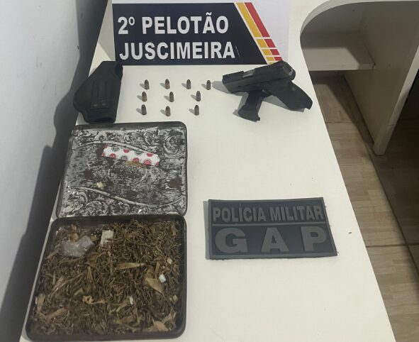 A PM apreendeu a arma, as munições, o entorpecente e um celular, que foram encaminhados para a Polícia Judiciária para continuidade das investigações.
