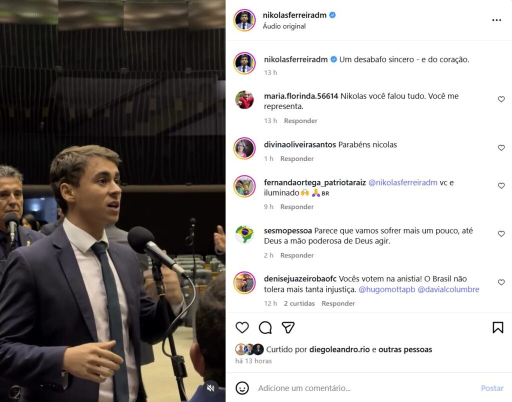 Nikolas Ferreira também destacou episódios recentes envolvendo aliados políticos. O parlamentar classificou como um marco histórico negativo a prisão de três generais, afirmando que nunca houve precedente semelhante no país. Ele citou ainda a cassação do mandato de um deputado federal por decisão monocrática do Supremo Tribunal Federal, o que, segundo ele, “fere a Constituição e o regimento interno”.