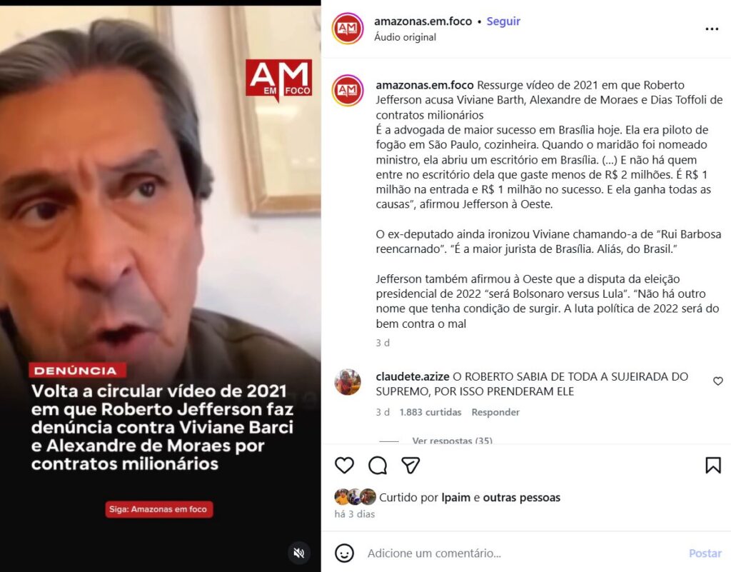 Voltam a circular na internet vídeos que mostram o ex-presidente Jair Bolsonaro e o ex-deputado Roberto Jefferson alertando sobre a atuação da advogada Viviane Barci de Moraes, mulher do ministro Alexandre de Moraes, em relação ao Banco Master.