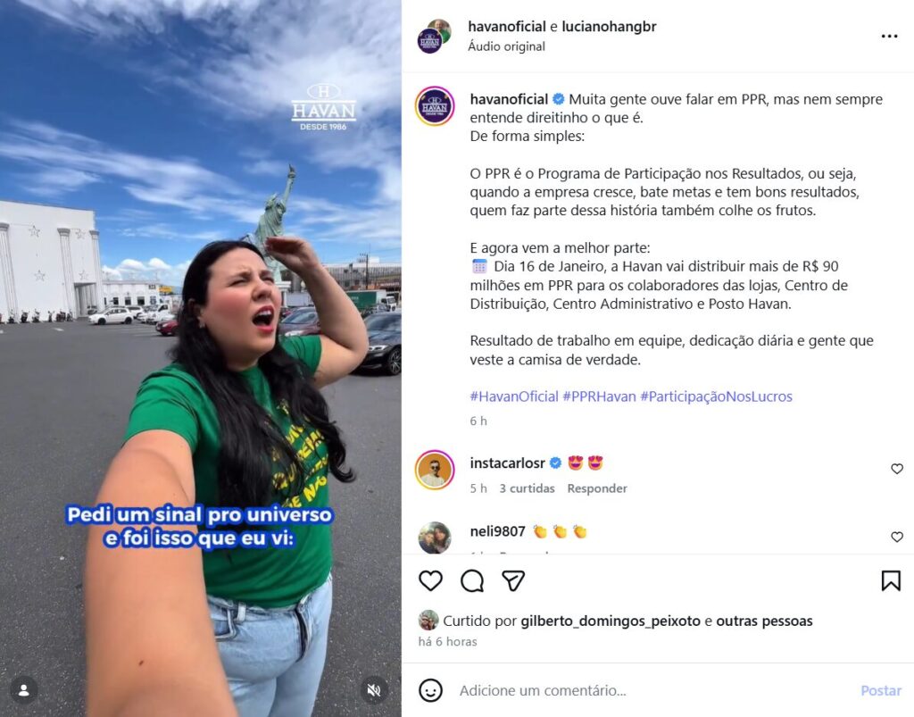 “[O PPR é] Resultado de trabalho em equipe, dedicação diária e gente que veste a camisa de verdade”, escreveu a Havan, em publicação no Instagram.