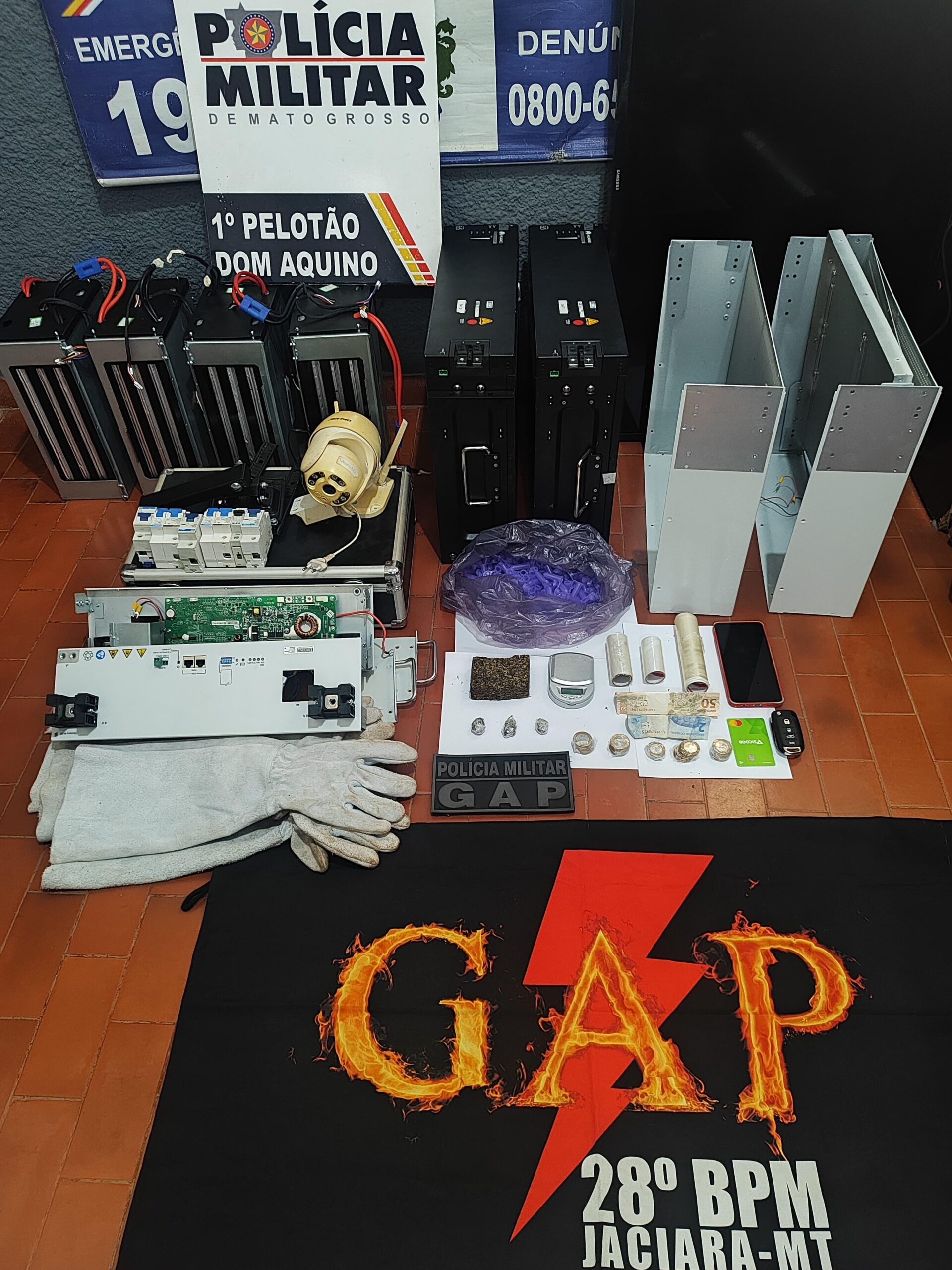 Em um dos quartos, os policiais localizaram diversos materiais eletrônicos, entre eles baterias de módulo central da marca Huawei, suportes, disjuntores, luvas próprias para manuseio de material energizado e uma câmera de monitoramento. Os objetos levantaram suspeita de serem provenientes de furtos ocorridos recentemente na região. Questionado sobre a procedência, o suspeito não apresentou explicações.