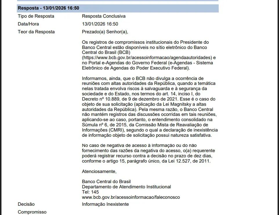 “Se as informações existem e estão sob sigilo, a resposta do Banco Central é incompleta, pois não indica o grau de classificação, a autoridade responsável, o prazo de restrição nem a fundamentação legal exigida pela LAI”, afirmou o deputado. “Por outro lado, se tais registros não existem, há uma contradição com declaração pública do próprio presidente do Banco Central de que todas as reuniões, comunicações e ações da instituição são devidamente documentadas. Em qualquer dos casos, a situação exige esclarecimentos compatíveis com os deveres constitucionais de transparência, publicidade e controle público.”