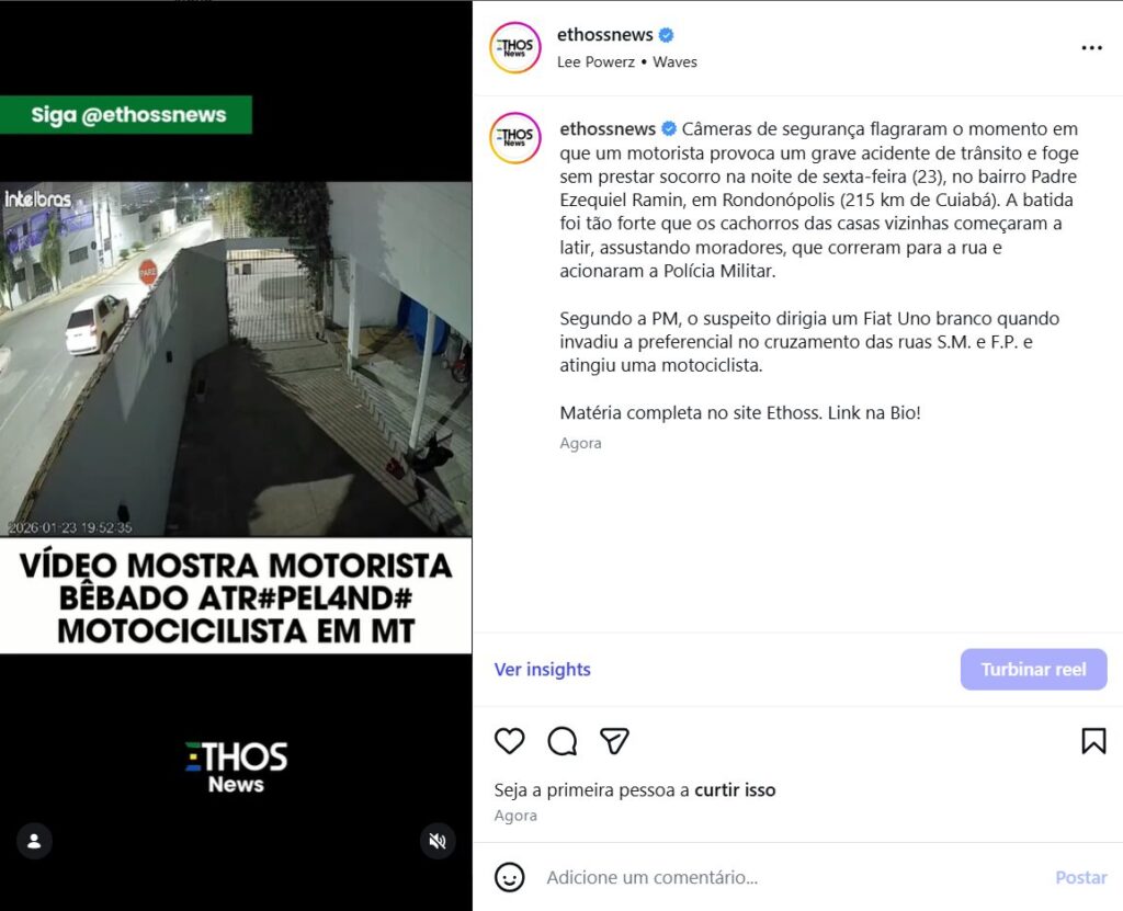 Câmeras de segurança flagraram o momento em que um motorista provoca um grave acidente de trânsito e foge sem prestar socorro na noite de sexta-feira (23), no bairro Padre Ezequiel Ramin, em Rondonópolis (215 km de Cuiabá). A batida foi tão forte que os cachorros das casas vizinhas começaram a latir, assustando moradores, que correram para a rua e acionaram a Polícia Militar.