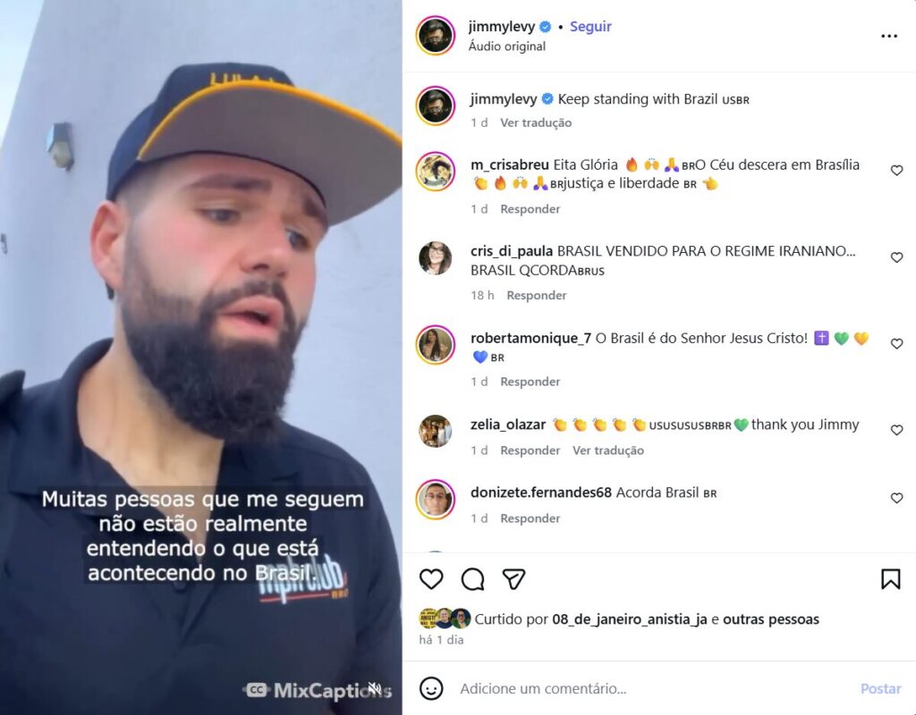 O cantor gospel norte-americano Jimmy Levy publicou em suas redes sociais neste sábado (24) um vídeo explicando a mobilização do deputado federal Nikolas Ferreira e pedindo aos seus compatriotas que orem pelo Brasil.