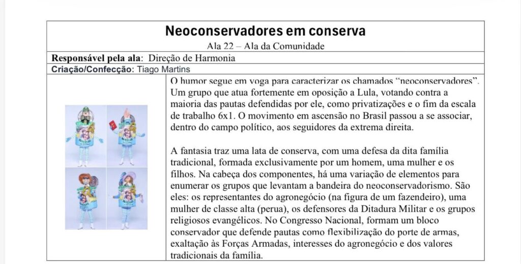 A Acadêmicos de Niterói, escola de samba que homenageou o presidente Lula (PT) no carnaval do Rio de Janeiro neste domingo (15) apresentou uma ala chamada “Neoconservadores em conserva”, com fantasias em formato de lata de conserva, em tom de sátira.