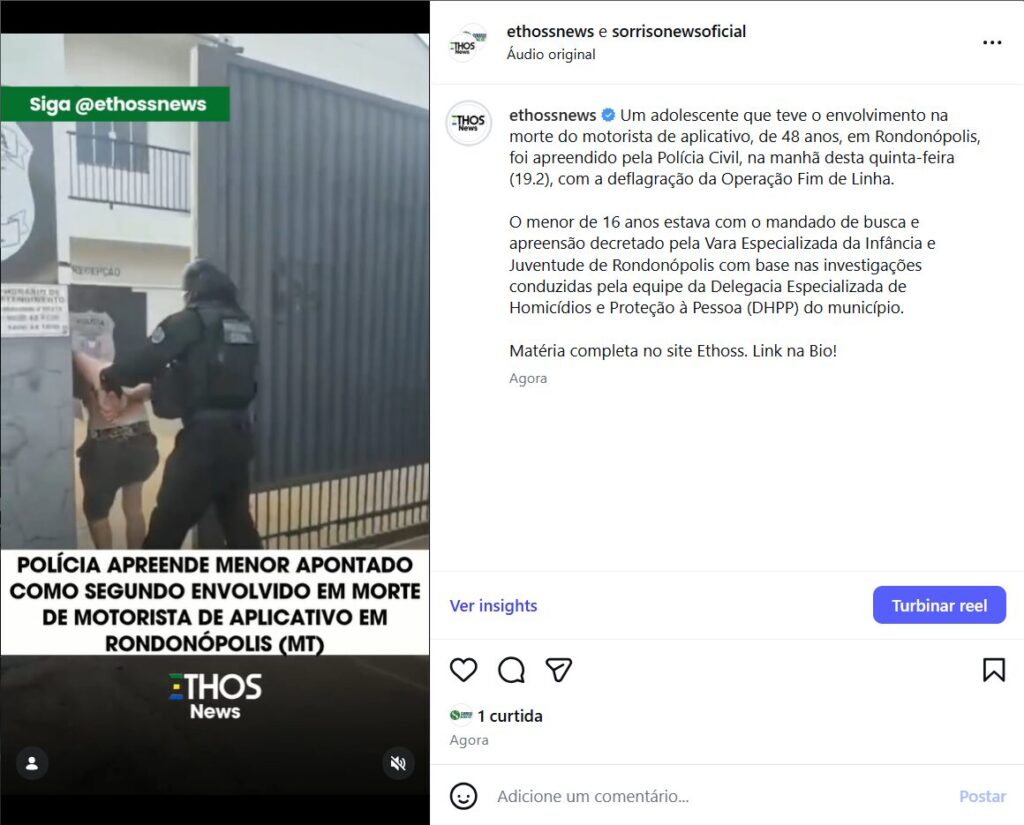 Um adolescente que teve o envolvimento na morte do motorista de aplicativo, de 48 anos, em Rondonópolis, foi apreendido pela Polícia Civil, na manhã desta quinta-feira (19.2), com a deflagração da Operação Fim de Linha.