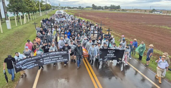 A abertura da Expodireto Cotrijal 2026 foi marcada por um protesto de produtores rurais na manhã desta segunda-feira, 9, em Não-Me-Toque (RS). Agricultores realizaram um “cortejo fúnebre” simbólico denominado “Luto pelo Agro”, com cruzes pretas e um caixão, para denunciar as dificuldades financeiras enfrentadas pelo setor.