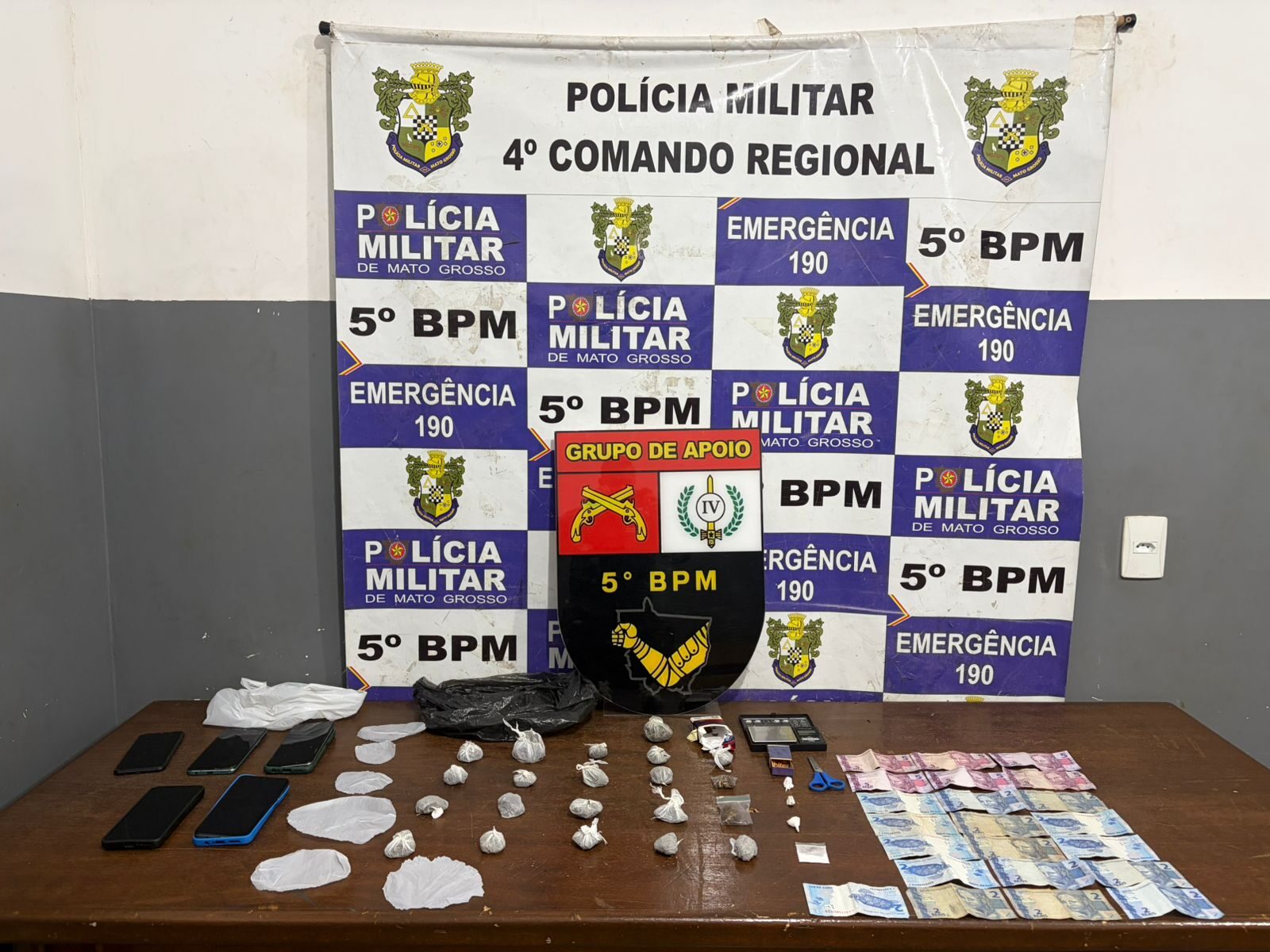No mesmo local, os militares localizaram ainda R$ 62 em dinheiro, em notas de baixo valor, e uma balança de precisão. Outros quatro aparelhos celulares também foram encontrados guardados em compartimentos menores do balcão.