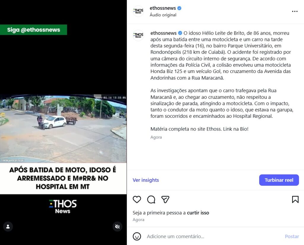 O idoso Hélio Leite de Brito, de 86 anos, morreu após uma batida entre uma motocicleta e um carro na tarde desta segunda-feira (16), no bairro Parque Universitário, em Rondonópolis (218 km de Cuiabá). O acidente foi registrado por uma câmera do circuito interno de segurança. De acordo com informações da Polícia Civil, a colisão envolveu uma motocicleta Honda Biz 125 e um veículo Gol, no cruzamento da Avenida das Andorinhas com a Rua Maracanã.