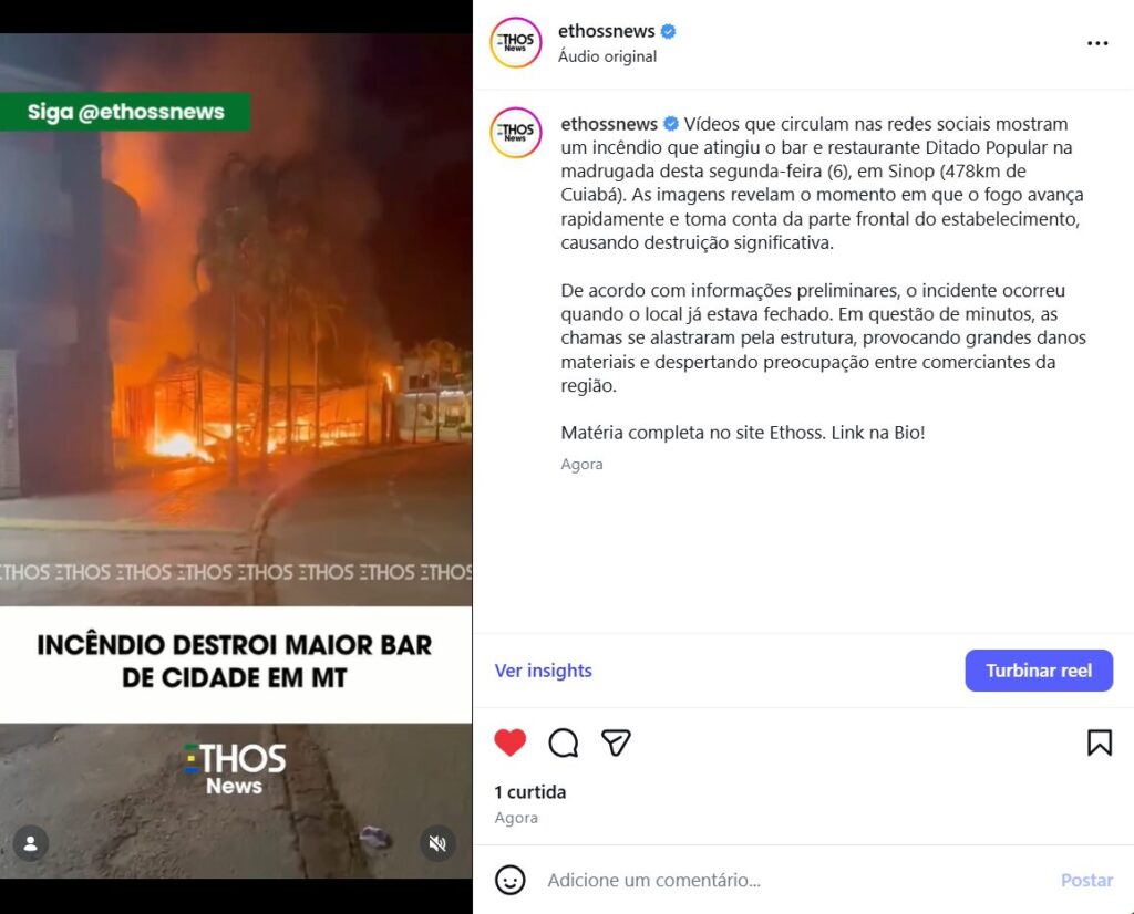 Vídeos que circulam nas redes sociais mostram um incêndio que atingiu o bar e restaurante Ditado Popular na madrugada desta segunda-feira (6), em Sinop (478km de Cuiabá). As imagens revelam o momento em que o fogo avança rapidamente e toma conta da parte frontal do estabelecimento, causando destruição significativa.