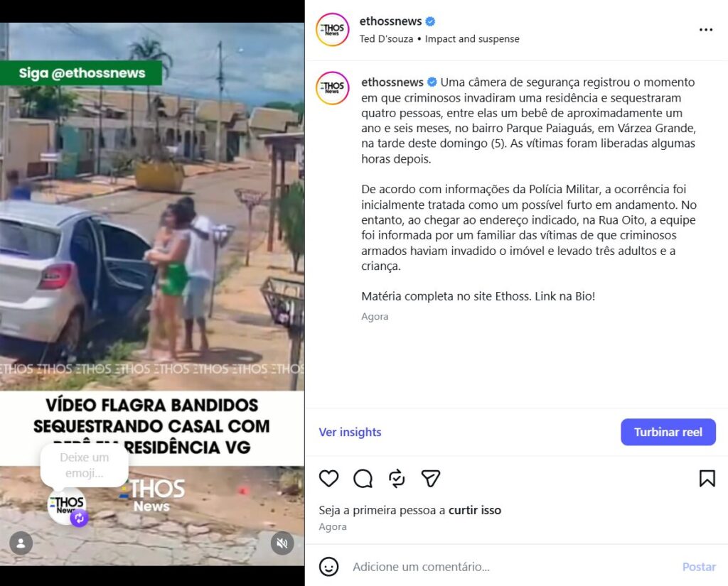 Uma câmera de segurança registrou o momento em que criminosos invadiram uma residência e sequestraram quatro pessoas, entre elas um bebê de aproximadamente um ano e seis meses, no bairro Parque Paiaguás, em Várzea Grande, na tarde deste domingo (5). As vítimas foram liberadas algumas horas depois.