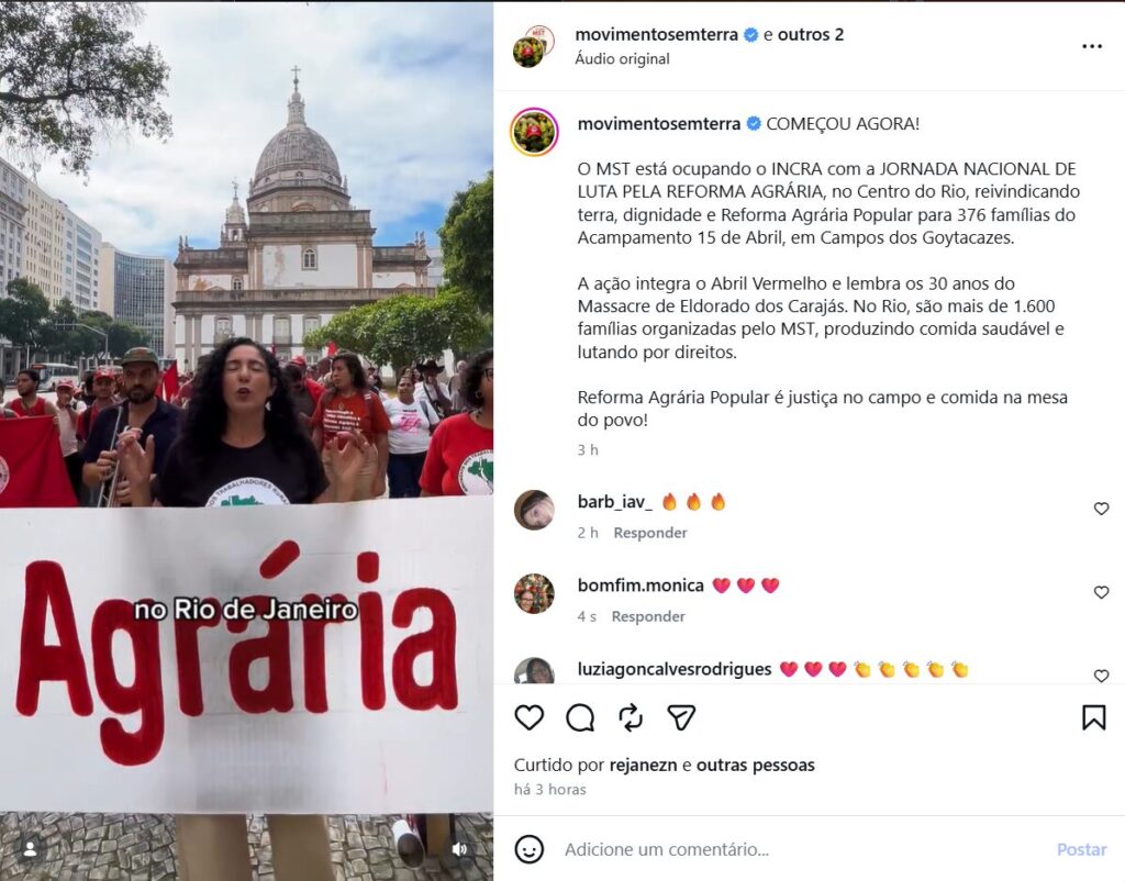 O MST também invadiu a superintendência do Incra no centro do Rio de Janeiro. O movimento afirma que a ação tem como objetivo pressionar por terra e políticas públicas para 376 famílias do Acampamento 15 de Abril, em Campos dos Goytacazes.